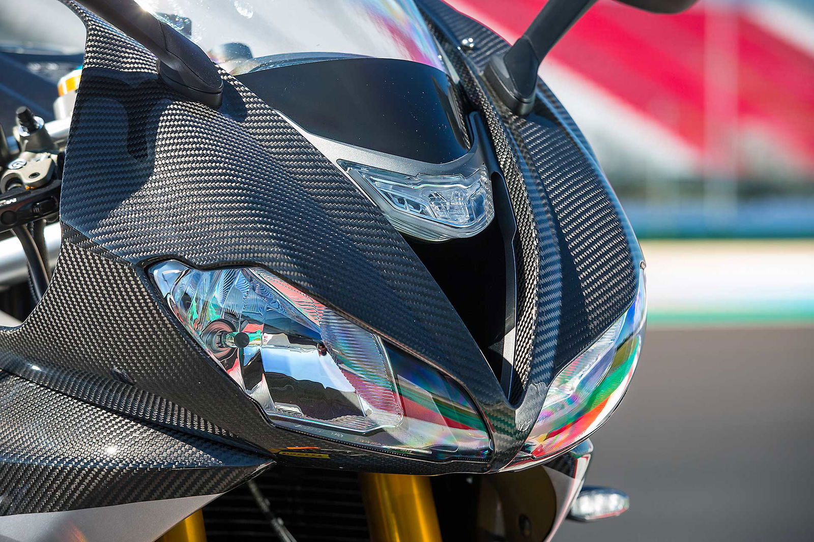 Anche a livello di ciclistica la Daytona non scherza, partendo come detto dall’apprezzatissimo telaio della supersport, la 765 monta sospensioni Ohlins (forcella NIX30 con steli da 43 mm e monoammortizzatore TTX36) e pinze Brembo Stylema (una primizia nel segmento, a oggi le montano solo Aprilia RSV4 1100 Factory e Ducati Panigale V4S) azionate da una pompa radiale MCS. Il peso ancora oggi non è dichiarato, anche se Triumph annuncia la moto come più leggera della precedente Daytona (che ricordiamolo, pesa nella versione R 167 kg a secco) grazie anche all’utilizzo di nuove ruote leggere, alla carenatura in carbonio e alla lucidatura di telaio e forcellone che non essendo più verniciati sono ora più leggeri. Quando prende la grammomania… Una moto da godersi rigorosamente da soli, perché la configurazione è monoposto.
