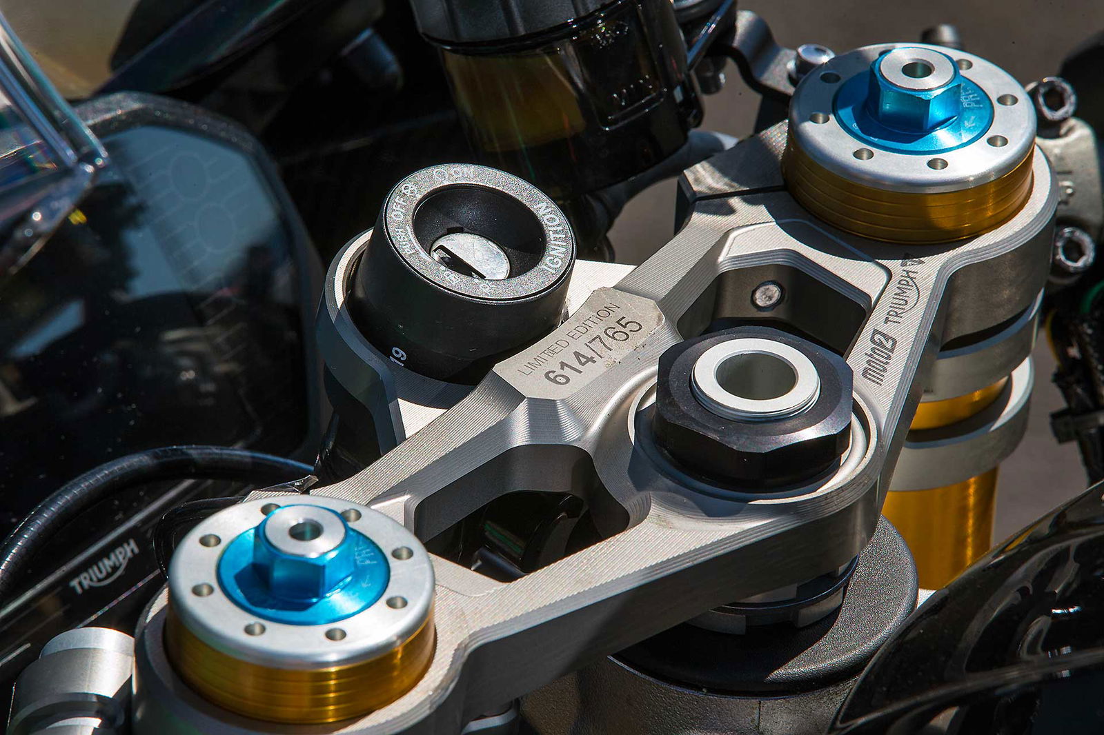 Il motore 765 è quello condiviso con la Street Triple RS, ma qui arriva a 130 cv (7 cv in più rispetto alla Street Triple RS) sfruttando gli upgrade che Triumph ha utilizzato per il motore Moto2. Le valvole di aspirazione sono in Titanio, i pistoni sono rinforzati, gli spinotti hanno un trattamento antifrizione DLC, gli alberi a camme hanno un profilo differente, sono nuove le bielle, i cornetti di aspirazione e l’albero motore, i cilindri, mentre è ovviamente più alto il rapporto di compressione. Il miglioramento di potenza e coppia (che arriva ora a 80 Nm) è annunciato non solo agli alti regimi ma lungo tutto l’arco di erogazione e si alza anche il regime massimo (+600 giri) con la zona rossa che inizia a 13.250 giri.
