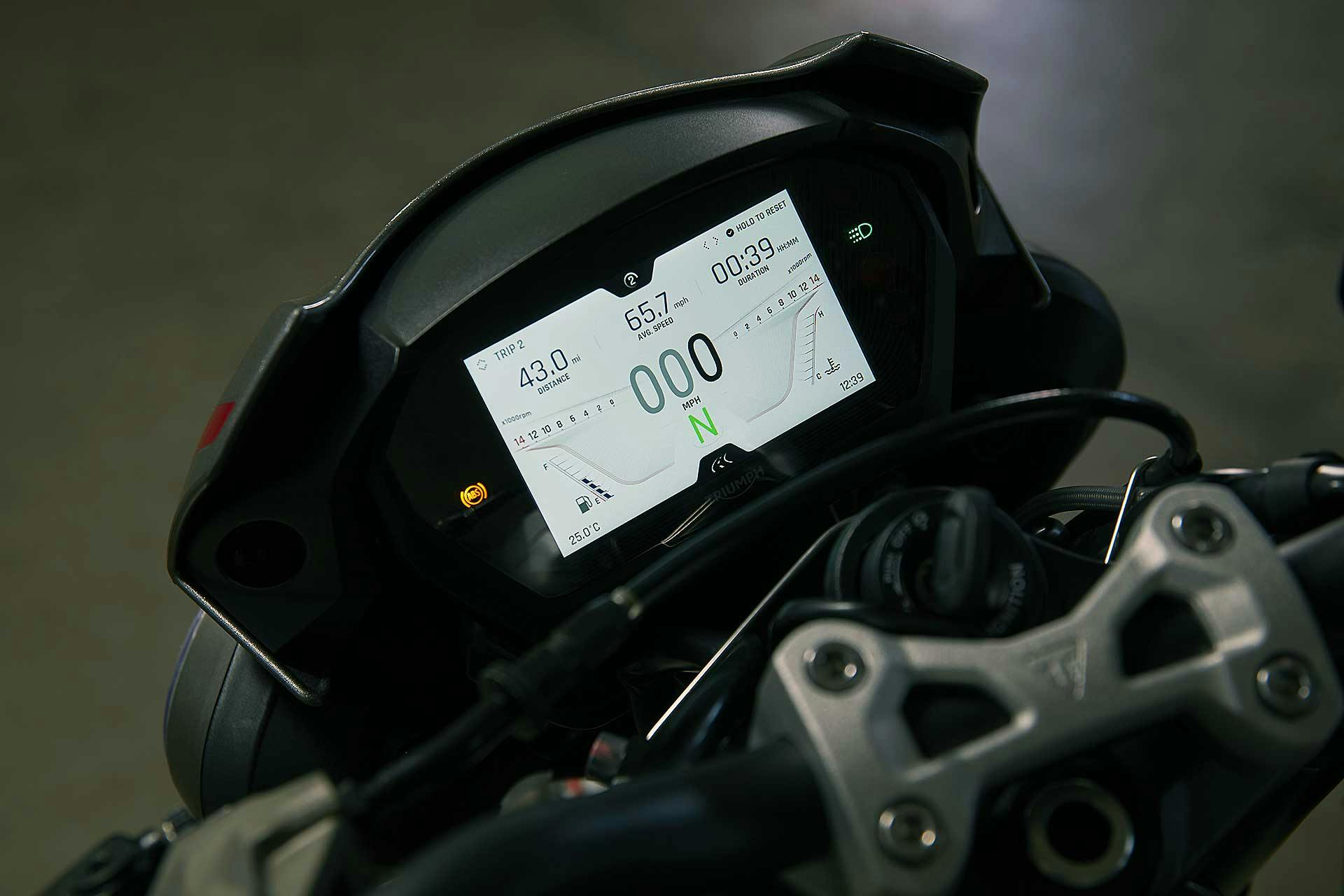 Di pari passo gli uomini di Hinckley hanno lavorato per offrire una risposta più decisa grazie a inerzie ridotte del 7%, (nuovi albero a camme e condotti, scarico, mentre albero motore, frizione e contralbero di bilanciamento sono ora lavorati da macchine ad alta precisione e più leggeri), mentre arriva una nuova frizione assistita e antisaltellamento. Frizione che non userete molto, visto che il cambio è dotato di quickshifter bidirezionale di serie. Prima e seconda marcia ora si accorciano leggermente. Confermati i cinque riding mode Road, Rain, Sport, Track e Rider (personalizzabile), che ora a detta di Triumph sono differenti dai precedenti. Resta invariata la ciclistica, che sfrutta ancora le esoteriche pinze Brembo radiali monoblocco M50 con pompa radiale a interasse variabile e una coppia “mista” di sospensioni: monoammortizzatore Ohlins STX40 e forcella Showa BPF da 41 mm, entrambi completamente regolabili.