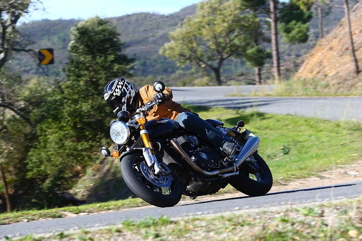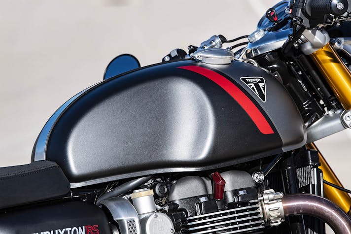 Ecco dunque la RS, ancora più potente, con un valore di potenza giusto per dare gusto, che ti aiuta ad usare tutti i cavalli e a farlo bene, lasciandoti il tempo di pensare e di non avere le coronarie in pressione ogni volta che giri il gas. Più che i 105 cavalli sono i 112 Nm di coppia a dettare le regole della guida. Spinta sempre pronta già a 2.500 giri. Pronta e piena, pronta ad allungarti le braccia dai 4.500 fino ai 7.500 giri dove, onestamente, sono arrivato solo un paio di volte. Perché non si sente il bisogno di forzare il bicilindrico parallelo a girare alto ma si preferisce, almeno nel mio caso, usarne la schiena: robusta e piatta.Il motore mi è famigliare, quello della Scrambler 1200 e quello della SpeedTwin: un bel pezzo di meccanica! Vibra poco, parla sottovoce, risponde allegro se accarezzi il gas. Morbida la frizione, anche se dopo una giornata a guidare tra le curve senti la fatica sul polso sinistro e infine il cambio che si conferma preciso negli innesti annunciati solo da un leggero rumore meccanico. In sella spazio per chi è alto, il monoposto permette di distendersi come se dovessi battere il record di velocità a Bonneville, con le pedane non troppo alte e la distanza dai mezzi manubri pensata per una posizione in sella più confortevole che sportiva.