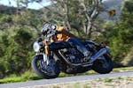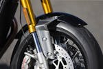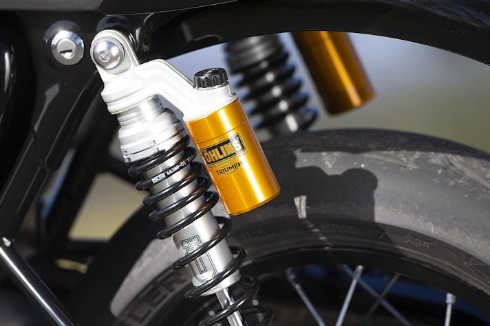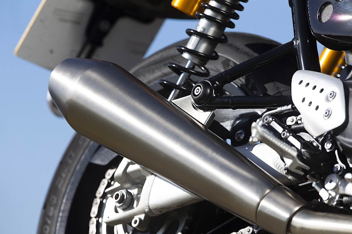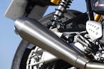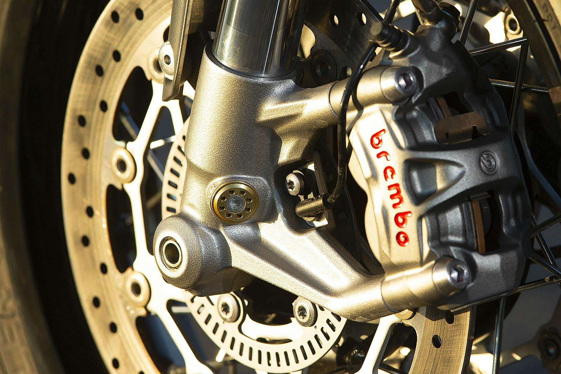 In Triumph hanno gente sensibile nel trovare il giusto setting per forcella e ammortizzatori. Perché la Thruxton RS ha le sospensioni tarate per essere solide in frenata e stabili a moto piegata. Elementi tecnici che sanno copiare l’asfalto mantenendo un livello di comfort insospettabile. I due ammortizzatori posteriori della Showa tengono la gomma posteriore ben attaccata a terra quando si dà gas. Davanti la forcella della Showa da 43 mm di diametro è pensata per garantire una bella agilità nella guida e un solido appoggio in frenata. L’avantreno non affonda benché sollecitato dai dischi da 310 mm della Brembo e le pinze monoblocco Radiali M50.