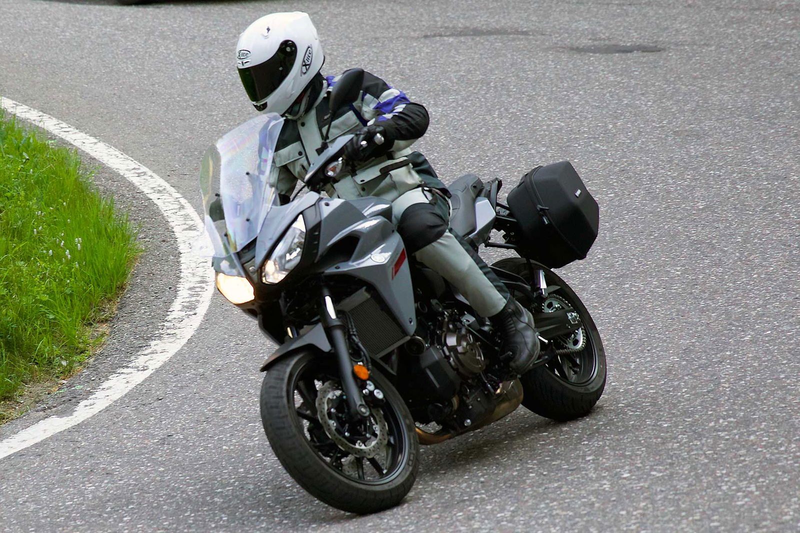 La Tracer 700 Touring Light conferma questa impressione anche in movimento, grazie anche al diametro di sterzata ridotto. La moto è agile negli spazi stretti, si disimpegna bene nei tornanti e si esibisce in pieghe di tutto rispetto nelle curve veloci. Solo quando si forza l’andatura l’assetto mostra di avere un’impostazione più turistica che sportiva, ma le piccole oscillazioni che si manifestano non devono preoccupare più di tanto; la Sport Tourer Yamaha resta sulla traiettoria impostata e riesce a non sfigurare neppure quando le si chiede di tenere il passo di moto sulla carta più prestanti. In questo senso gioco un ruolo determinante il motore che sale rapidamente di giri con un piglio non comune per questa categoria e si dimostra elastico anche quando gli si chiede di riprendere con inserita una marcia più lunga del giusto.